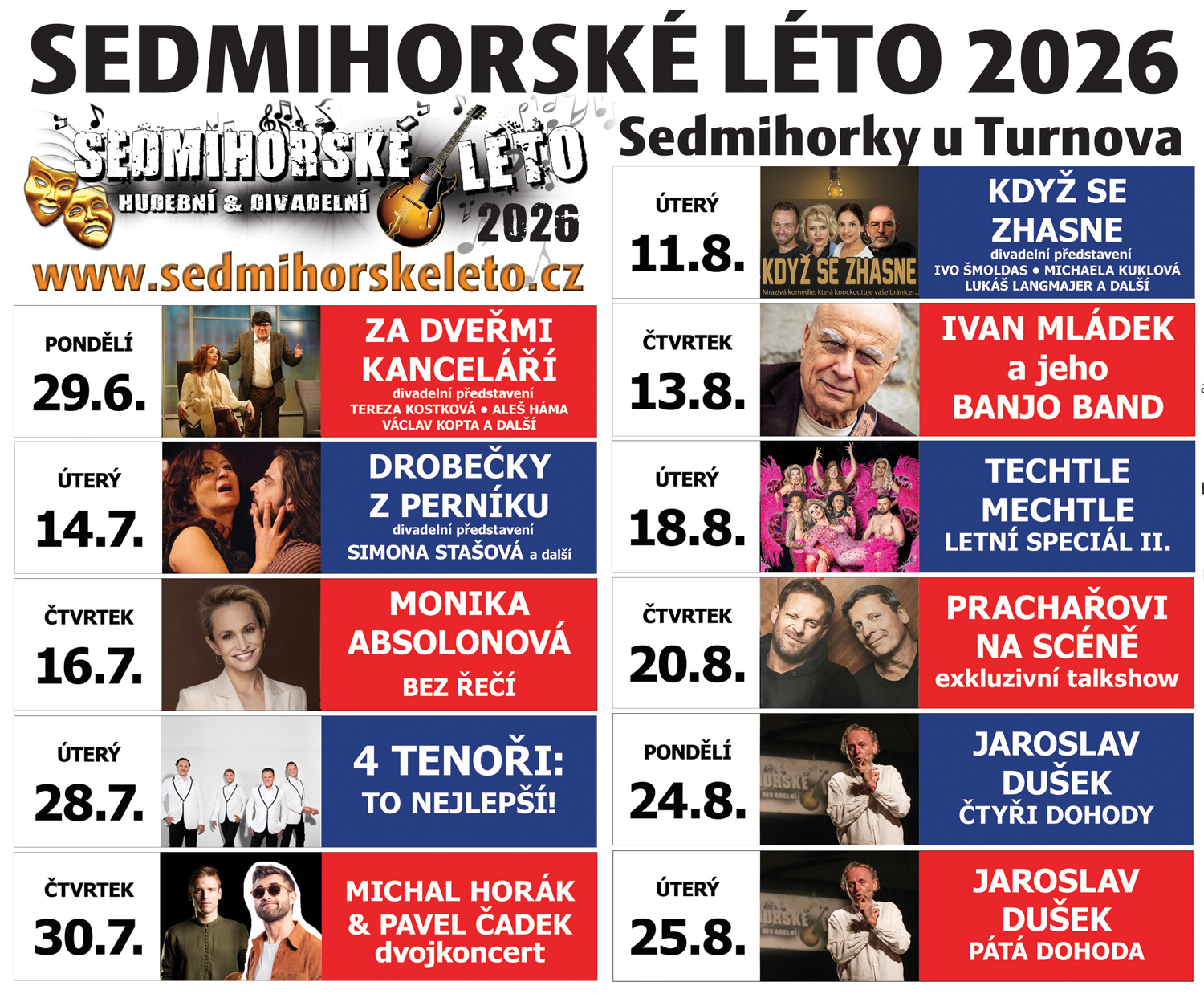 Festival Sedmihorské léto, oblíbené kulturní pásmo v srdci Českého ráje, zahajuje předprodej vstupenek na rok 2026. V příštím roce se tak jeho brány otevřou už pošestnácté. Program opět slibuje pestrou směsici divadelních představení, hudebních vystoupení i netradičních večerů plných zábavy a humoru a to pro mix všech generací. Kulturní léto pod širým nebem – ovšem také s obrovskou pergolou, která zastřešuje většinu hlediště - které se odehrává v areálu v Sedmihorkách u Turnova, letos nabídne opět mimořádná jména i inscenace.