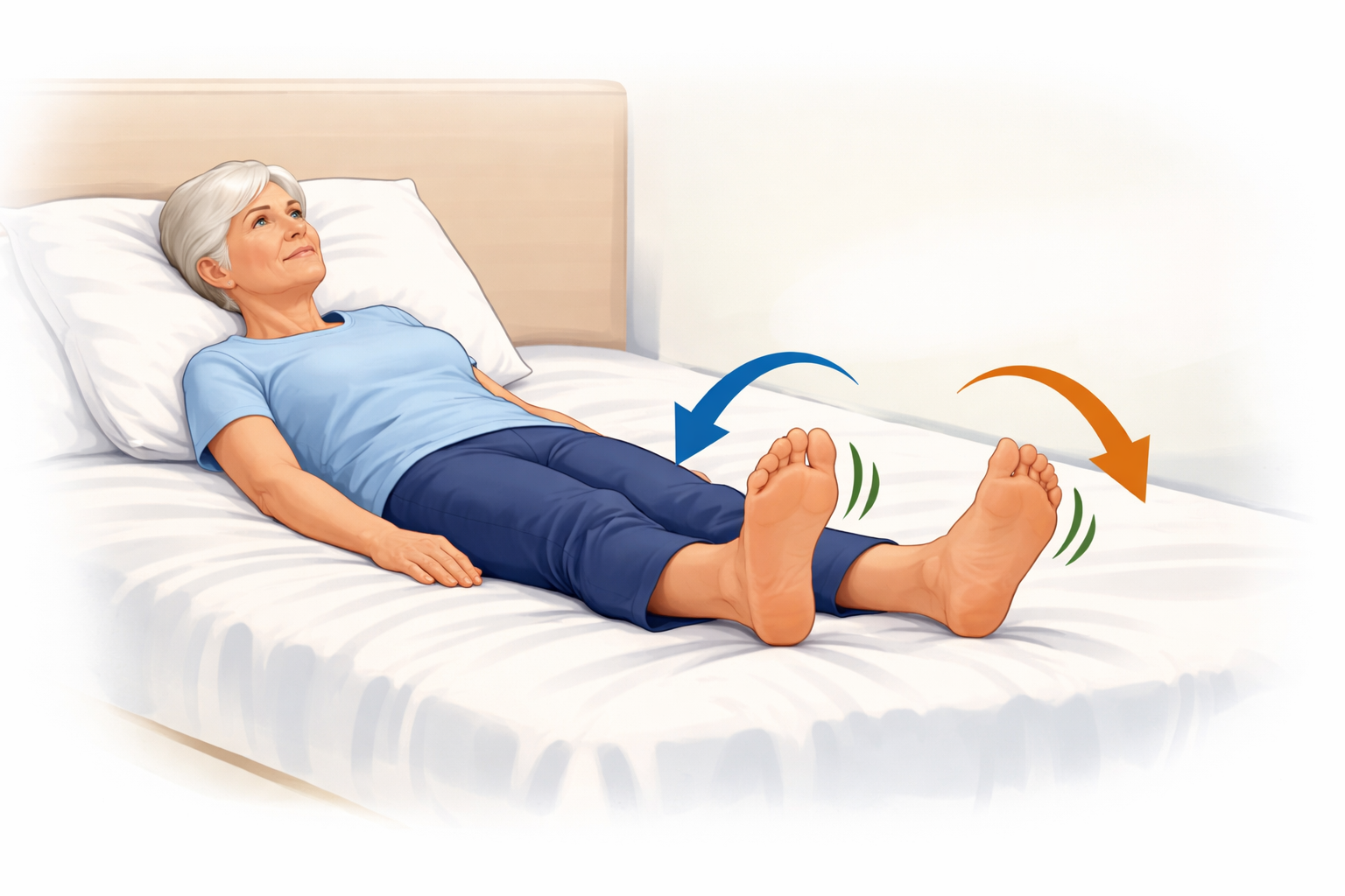 Lehněte si na záda, nohy natáhněte. Pomalu přitahujte špičky chodidel směrem k sobě a poté je odtlačujte.