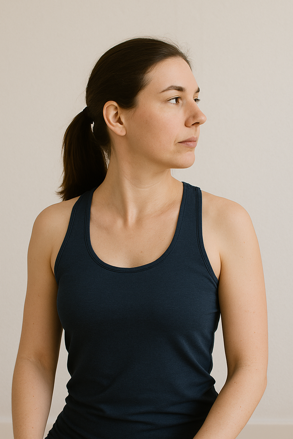 Provedení: Nakloň hlavu k pravému rameni (uchem k rameni), ramena zůstávají rovně. Můžeš lehce přitáhnout hlavu rukou, ale ne do bolesti.