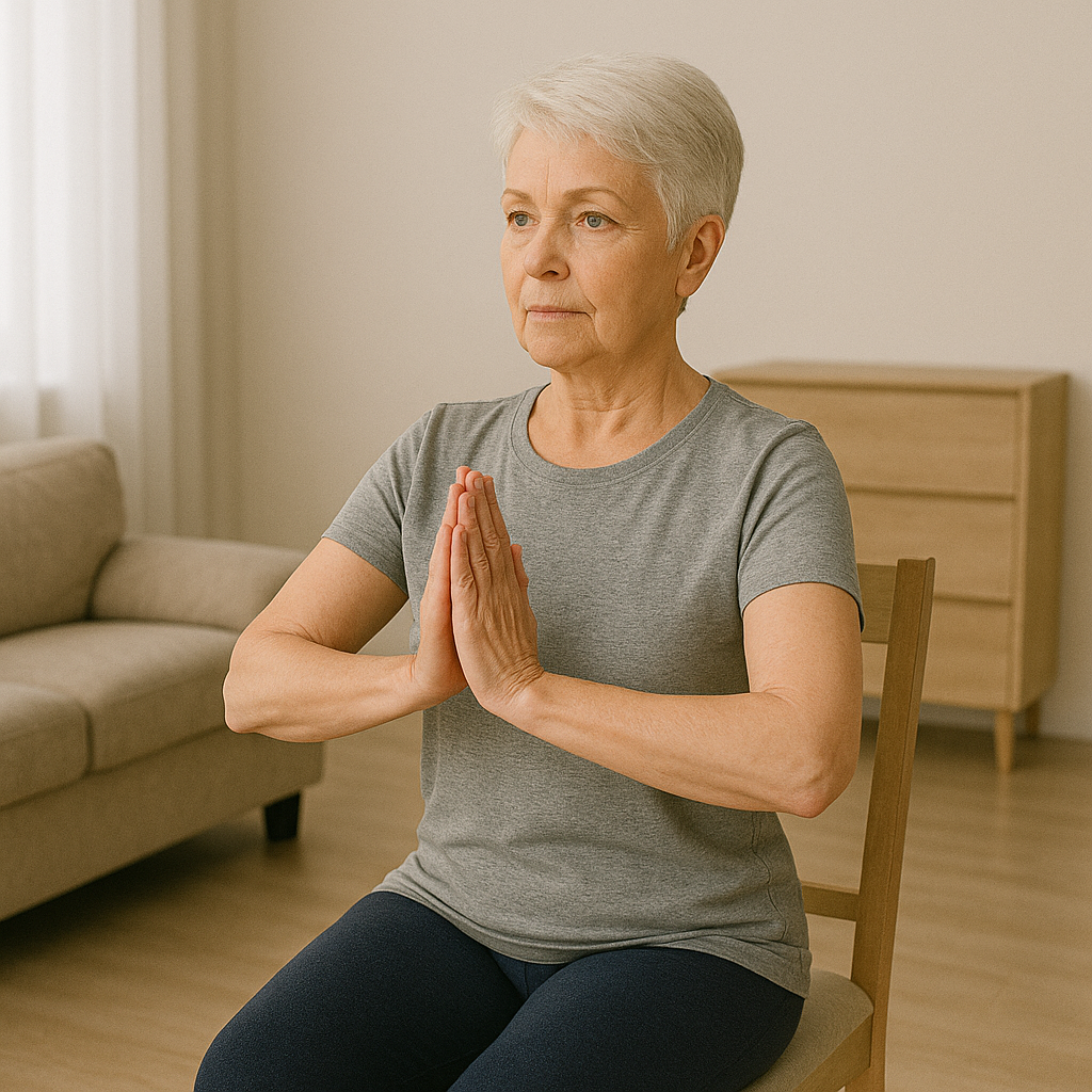 Stlačujte dlaně proti sobě a aktivujte prsní svaly. Držte cca 10 vteřin, poté uvolněte a pokračujte plynulým dechem. Měňte výšku rukou (úroveň ramen, střed hrudníku, pod hrudníkem).