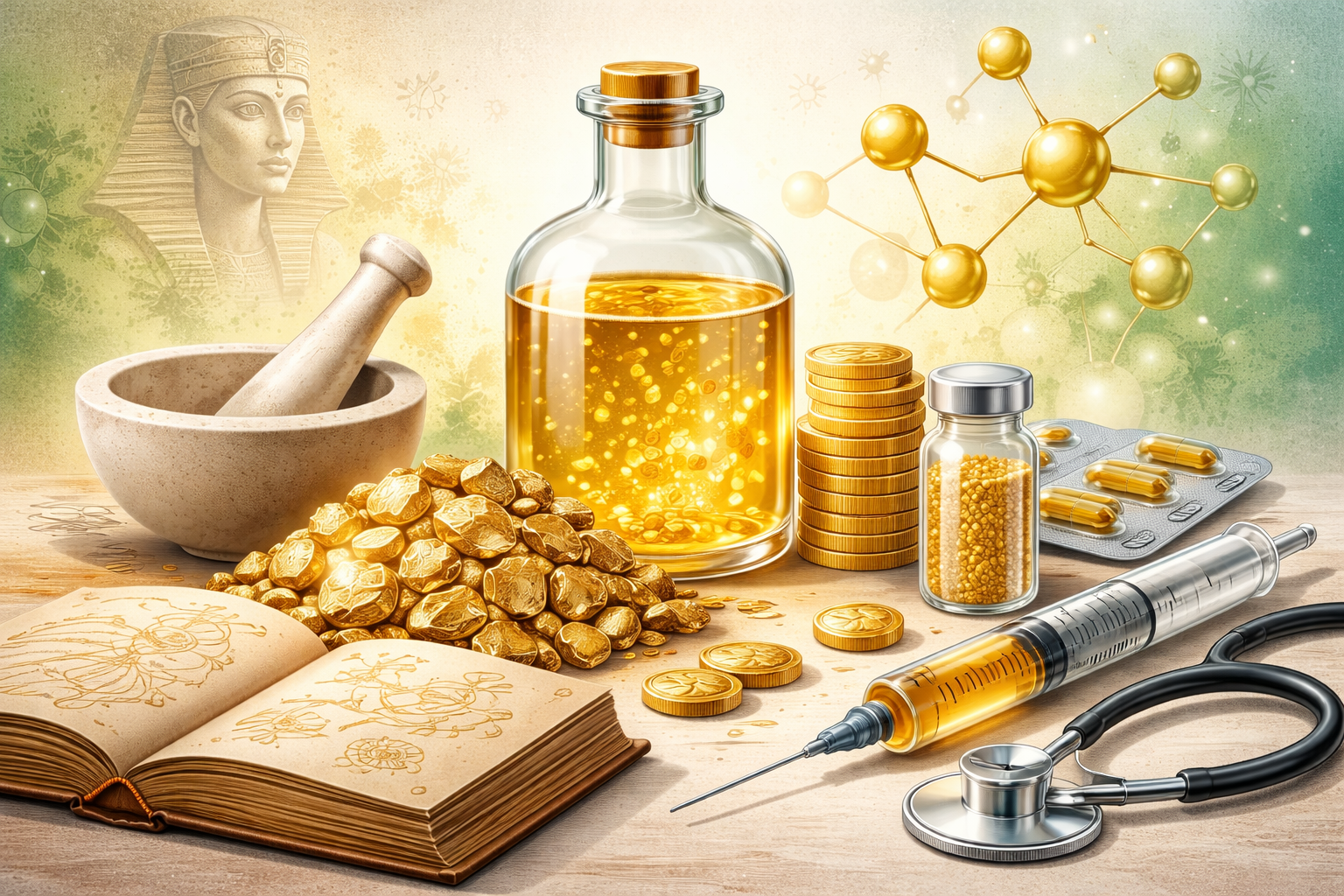 Zlato se používá pro podporu zdraví a vitality na všech kontinentech. Regenerační vlastnosti zlata jsou uznávané v Číně. Čínští rolníci vaří rýži se zlatou mincí, aby se tento kov dostal do těla a luxusní čínské restaurace používají 24-karátové zlaté lístky při přípravě jídel. Staré hieroglyfy odhalily, že lidé si již před více než 4500 lety míchaly zlatý prášek do nápojů pro zlepšení vitality. Egypťané byli přesvědčeni, že zlato léčí ducha a tělo. V tradiční čínské medicíně posilují léky ze zlata navíc posilují osu ledviny – měchýř. Cílem léčby bylo získat více životní energie. Ve středověku se stal ryzí kov prostředkem proti stárnutí. Arabští lékaři ho propagovali jako studnici mládí. V Evropě byly v módě elixíry nesmrtelnosti se zlatým prachem po celá staletí. Zakladatel moderní farmakologie a alchymista Paracelsus vymyslel v 16. století recept na tekuté zlato „aurum potabile“. Jednalo se o poživatelné zlato, preparát s údajně mimořádně zázračnými léčivými účinky. Francouzský matematik René Descartes věřil po požití zlata ve věčný nebo přinejmenším velmi dlouhý život. I když se zlatem prokazatelně nedaly léčit ani deprese, epilepsie, migréna nebo syfilis, byl prokázán jeho antibakteriální účinek.